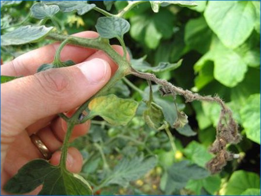 W uprawach pomidora patogen może powodować brunatnienie łodyg i ogonków liściowych, a następnie ich łamanie się w miejscach osłabionych przez nekrozę. Podobny przebieg obserwuje się u papryki oraz fasoli.