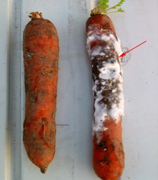 W przechowalniach choroba prowadzi do miękkiej, wodnistej zgnilizny korzeni i bulw, wtórnego porażenia sąsiednich roślin i rozwoju białej grzybni i sklerocjów na powierzchni.